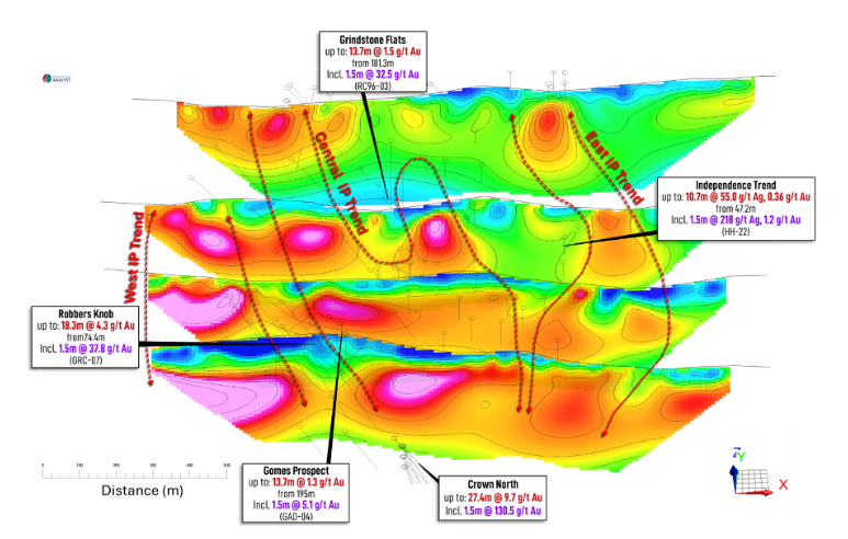 Past exploration has identified at least five prospects - Robbers Knob, Gomes, Crown North, Grindstone Flats, and the Independence