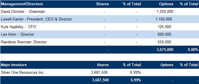 Silver One Resources (TSXV: SVE/MCAP: $180M) is the largest shareholder