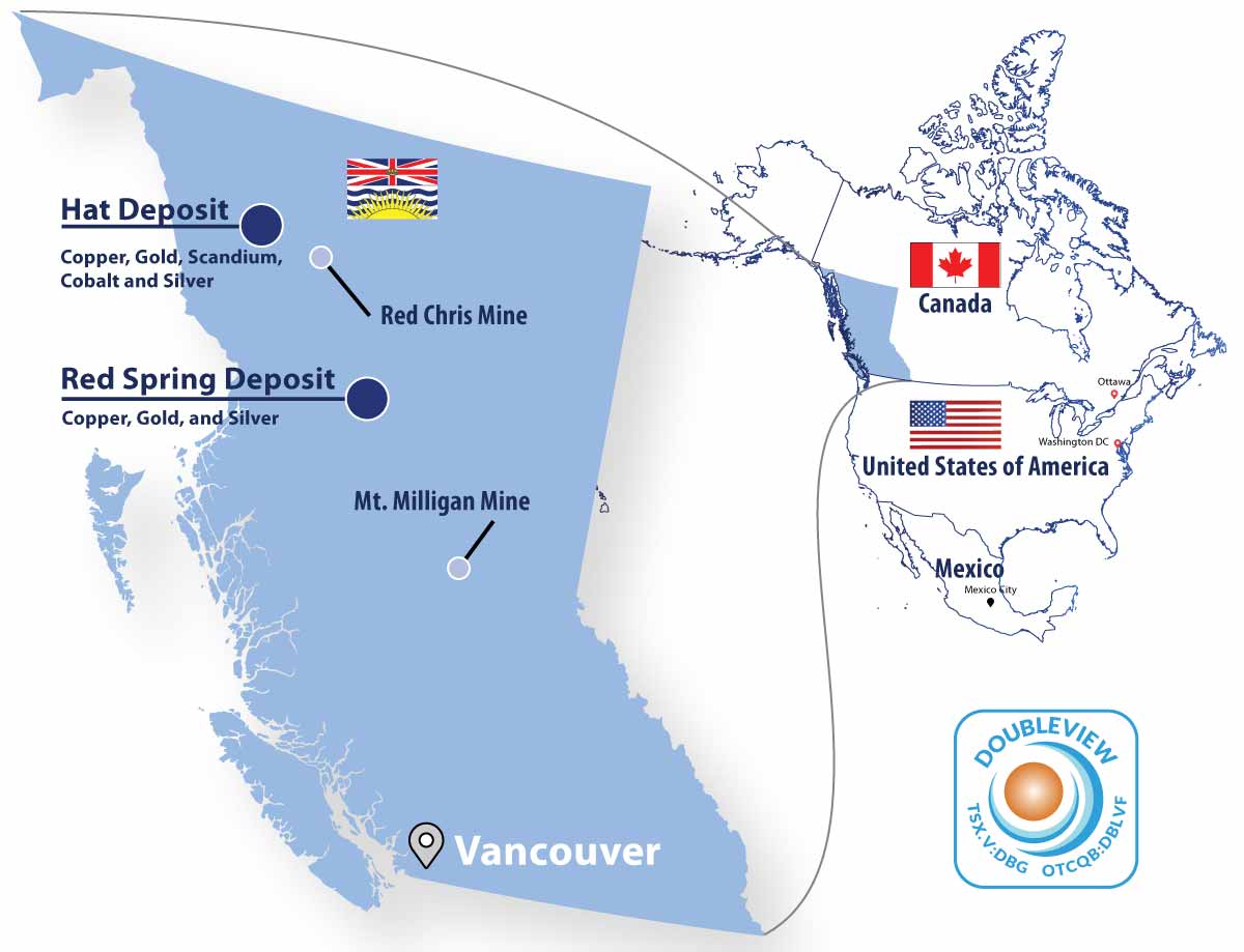 The Hat projected, located in B.C.’s Golden Triangle, one of the world’s most mineralized regions, hosts polymetallic porphyry mineralization containing copper, gold, silver, cobalt, and scandium