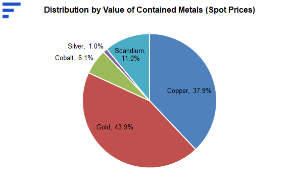 Based on spot prices, we note that gold accounts for 44% of resources, followed by copper (38%), scandium (11%), cobalt (6%), and silver (1%)