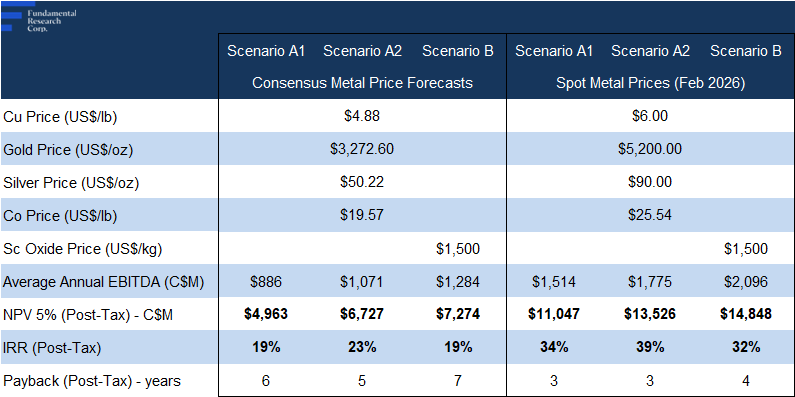 Using Feb 2026 spot prices, AT-NPV5% rises to $14B, with an IRR of 39%, well above the 15% IRR considered attractive for mining projects