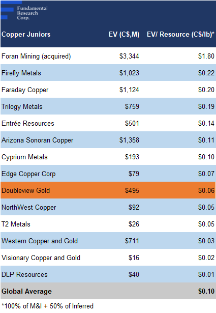 Relative to copper juniors, DBG is trading at $0.06/lb (previously $0.03/lb) vs the comparables average of $0.10/lb (previously $0.05/lb), a 36% discount