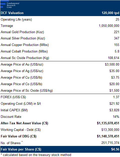 We are reiterating our BUY rating, and raising our fair value e stimate from $1.39 to $3.43/share (the average of our three valuation models). DBG’s strong stock performance reflects its significant resource growth, and robust PEA results. The presence of critical minerals like scandium and cobalt, along with low cash costs and high by-product credits, makes the project highly attractive. Trading well below NPV, and backed by a favorable metals outlook, we believe DBG offers significant upside potential.