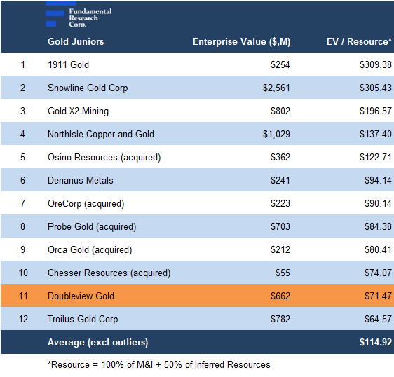 Relative to gold juniors, DBG is trading at $71/oz (previously $57/oz) vs the comparables average of $115/oz (previously $74/oz), a 38% discount