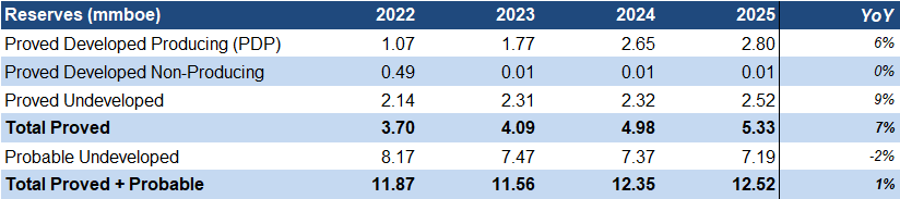 BRK has produced over 3.5 mmboe since 2021, with 2.8 mmboe remaining in the existing nine wells, and 9.81 mmboe from 19 undeveloped targets, totaling 12.52 mmboe in remaining reserves