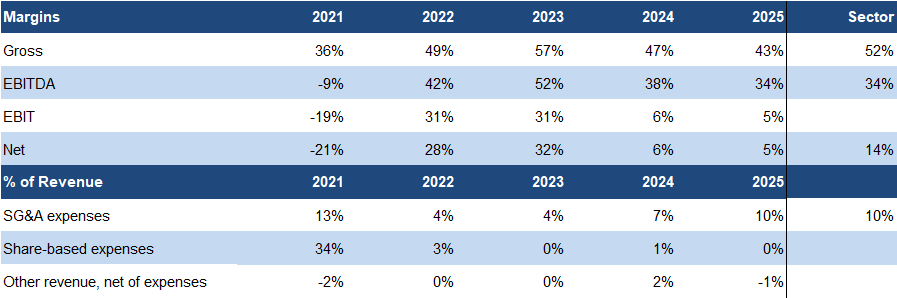 EBITDA margins align with the sector, while net margins are lower due to higher early-life depreciation from steep decline rates in horizontal wells